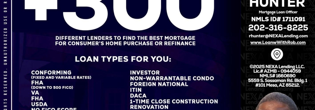 Hi, my name is Robert Hunter. I’m a Loan Officer with NEXA Lending LLC., offering personalized mortgage solutions, fast customized quotes, great rates and service with integrity.