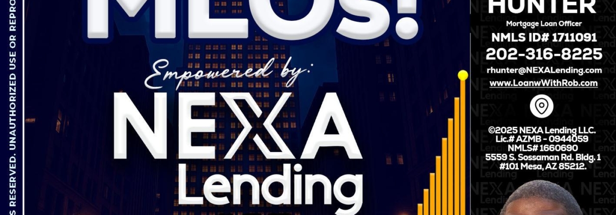 3405 MLOs - Robert Hunter -Mortgage Loan OfficerHi, my name is Robert Hunter. I’m a Loan Officer with NEXA Mortgage LLC., offering personalized mortgage solutions, fast customized quotes, great rates and service with integrity.