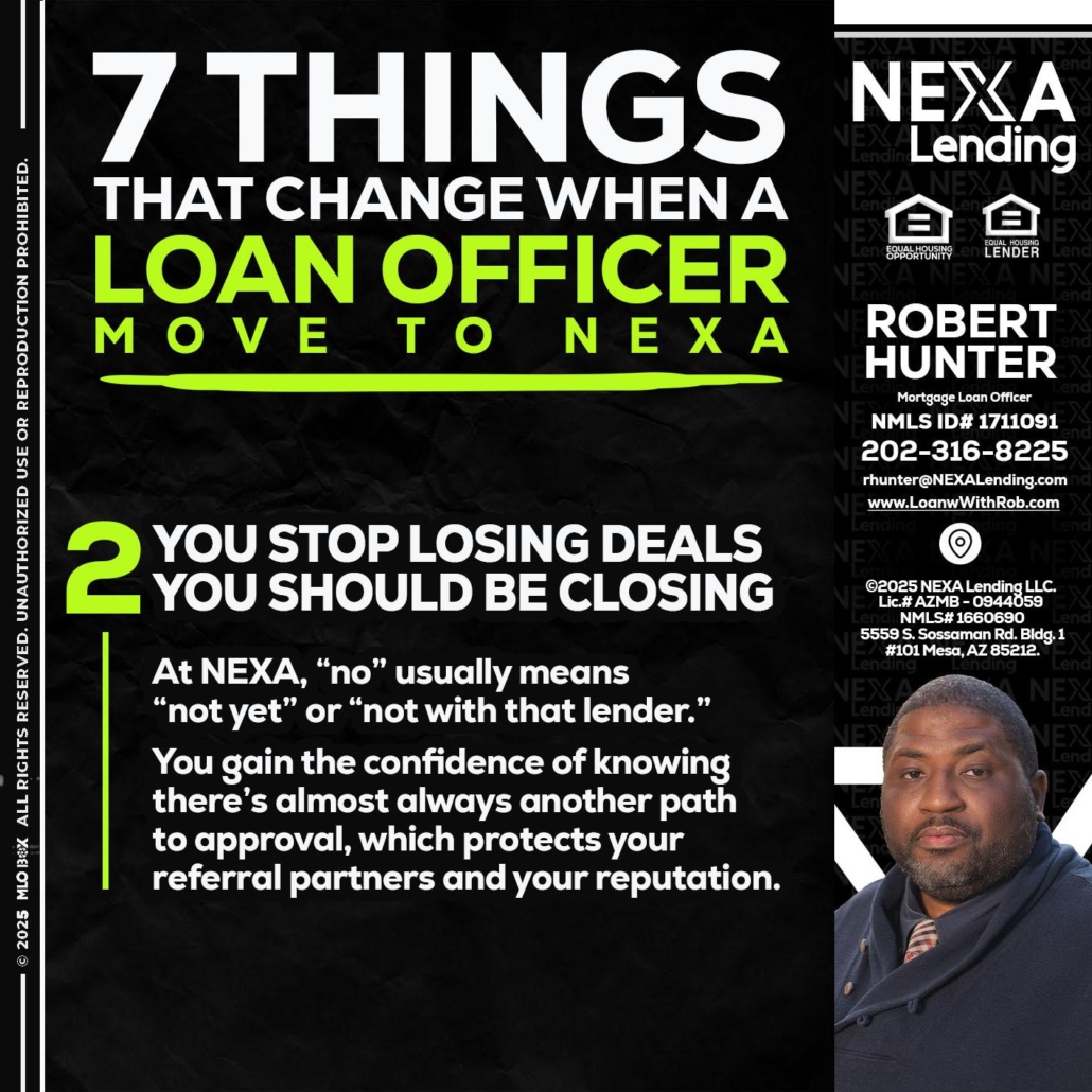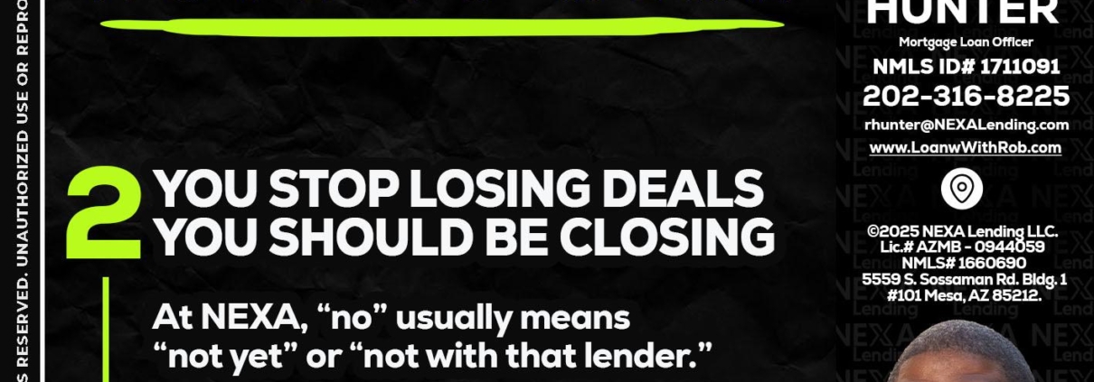 Hi, my name is Robert Hunter. I’m a Loan Officer with NEXA Lending LLC., offering personalized mortgage solutions, fast customized quotes, great rates and service with integrity.