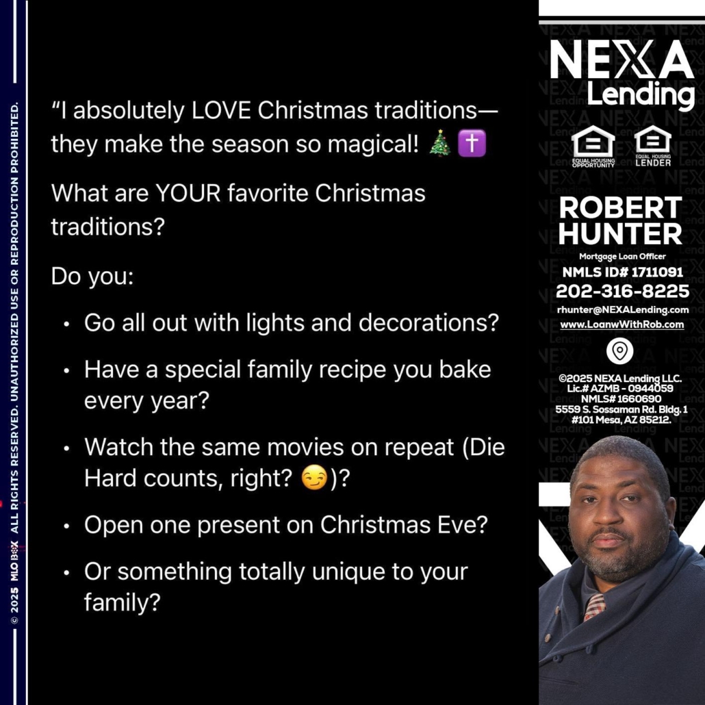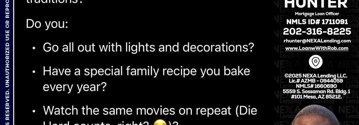 Hi, my name is Robert Hunter. I’m a Loan Officer with NEXA Lending LLC., offering personalized mortgage solutions, fast customized quotes, great rates and service with integrity.