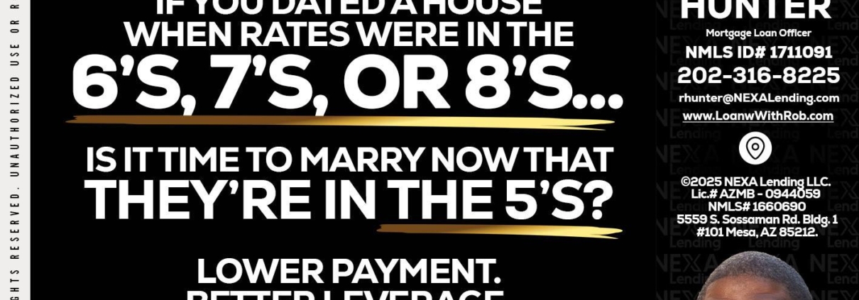 Hi, my name is Robert Hunter. I’m a Loan Officer with NEXA Lending LLC., offering personalized mortgage solutions, fast customized quotes, great rates and service with integrity.