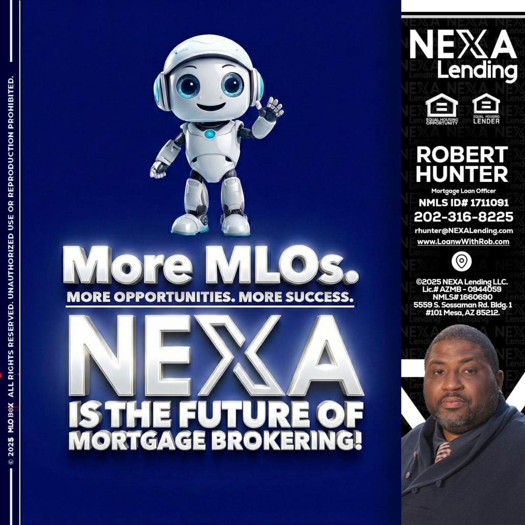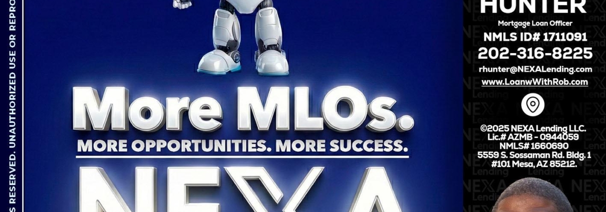 Hi, my name is Robert Hunter. I’m a Loan Officer with NEXA Lending LLC., offering personalized mortgage solutions, fast customized quotes, great rates and service with integrity.