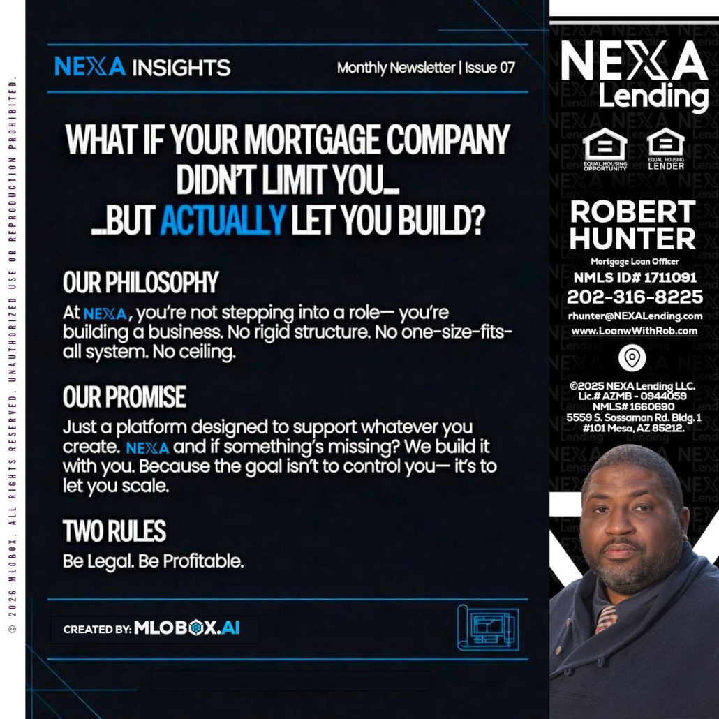 Hi, my name is Robert Hunter. I’m a Loan Officer with NEXA Lending LLC., offering personalized mortgage solutions, fast customized quotes, great rates and service with integrity.