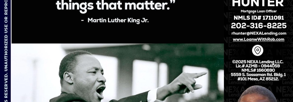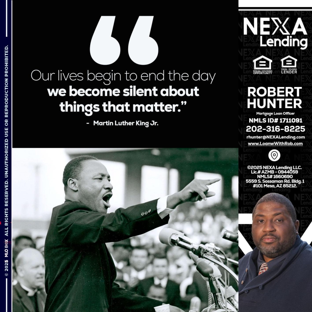 our lives MLK DAY - Robert Hunter -Mortgage Loan OfficerHi, my name is Robert Hunter. I’m a Loan Officer with NEXA Lending LLC., offering personalized mortgage solutions, fast customized quotes, great rates and service with integrity.