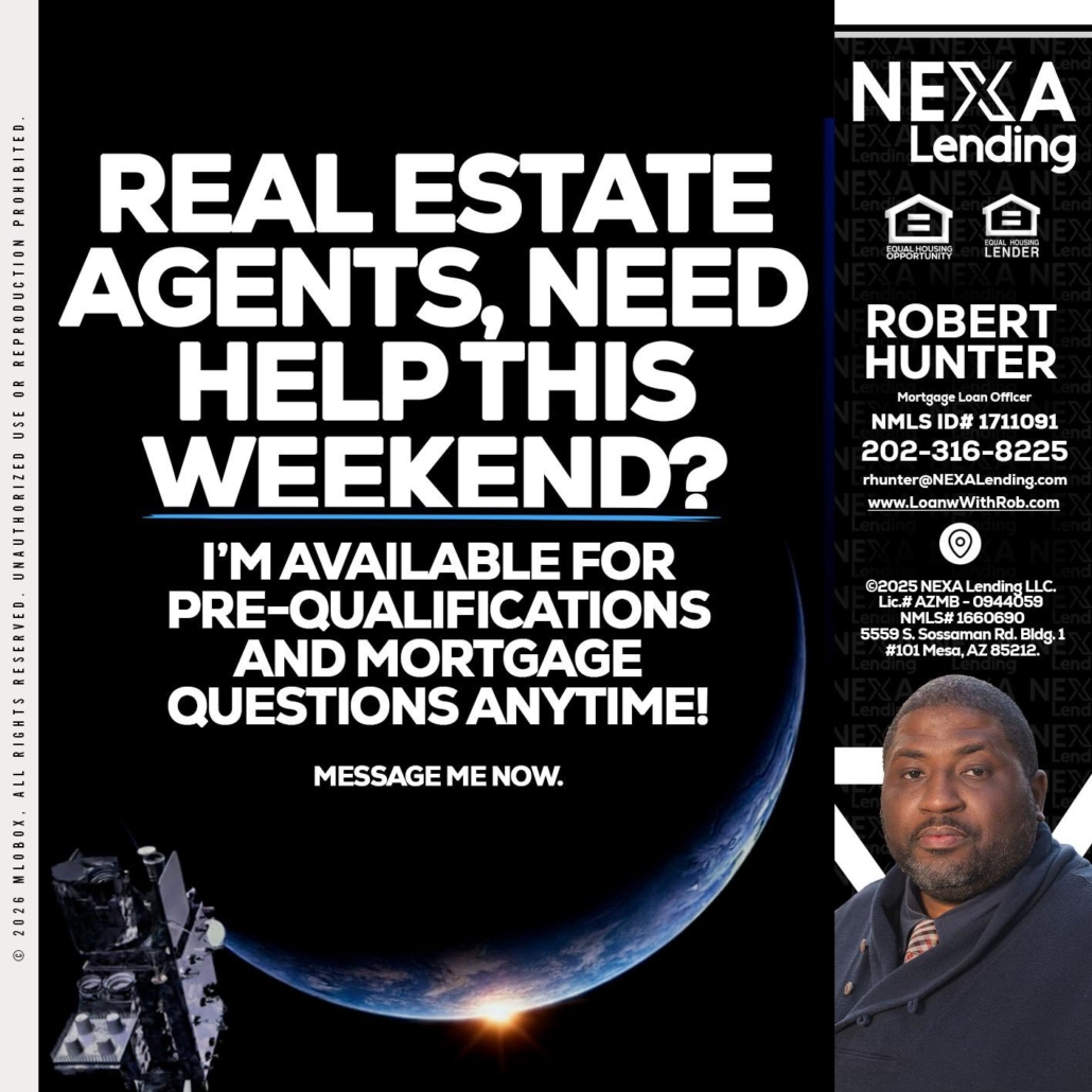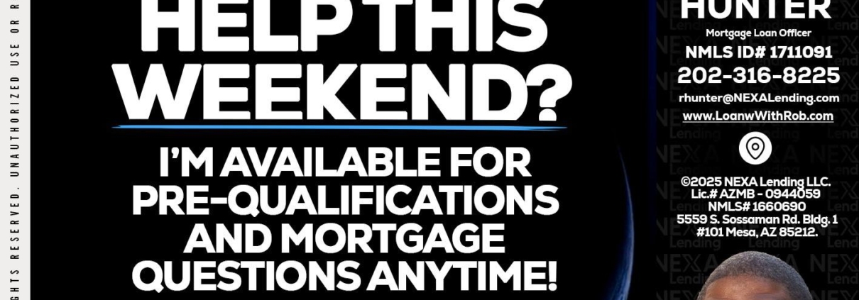 Hi, my name is Robert Hunter. I’m a Loan Officer with NEXA Lending LLC., offering personalized mortgage solutions, fast customized quotes, great rates and service with integrity.