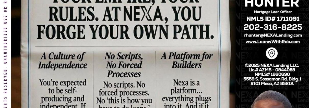 Hi, my name is Robert Hunter. I’m a Loan Officer with NEXA Lending LLC., offering personalized mortgage solutions, fast customized quotes, great rates and service with integrity.