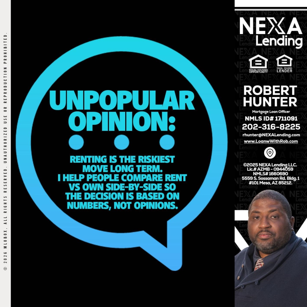 unpopular opinion - Robert Hunter -Mortgage Loan OfficerHi, my name is Robert Hunter. I’m a Loan Officer with NEXA Lending LLC., offering personalized mortgage solutions, fast customized quotes, great rates and service with integrity.