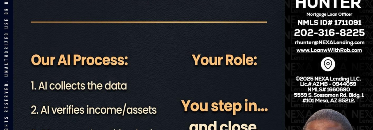 Hi, my name is Robert Hunter. I’m a Loan Officer with NEXA Lending LLC., offering personalized mortgage solutions, fast customized quotes, great rates and service with integrity.