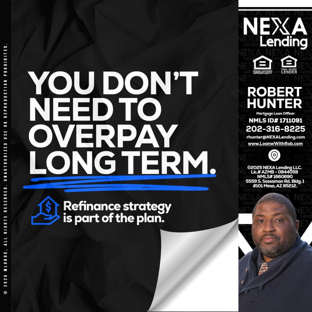 Hi, my name is Robert Hunter. I’m a Loan Officer with NEXA Lending LLC., offering personalized mortgage solutions, fast customized quotes, great rates and service with integrity.