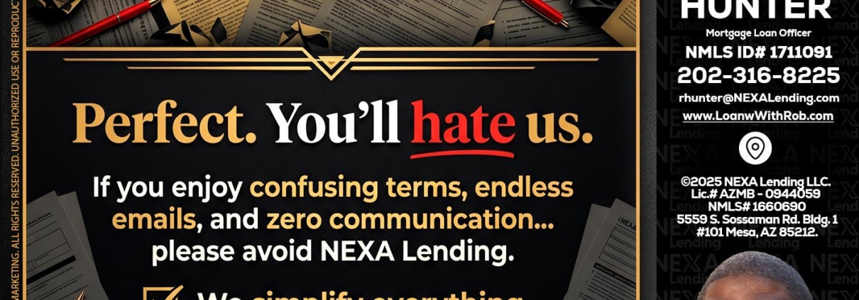 Hi, my name is Robert Hunter. I’m a Loan Officer with NEXA Lending LLC., offering personalized mortgage solutions, fast customized quotes, great rates and service with integrity.